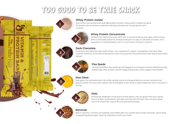 Ingredients - Soy Crispies, Almonds, Whey Protein Concentrate, Whey Protein Isolate, Milk Protein Concentrate, Isolated Soy Protein, Dark Chocolate Compound, Fructo Oligo Saccharides, Vegetable Glycerine, Oats, Dried, Desi Ghee, L-Arginine, Taurine, Flax Seeds, Vitamins and Minerals, Soy Lecithin, Rosemary for freshness