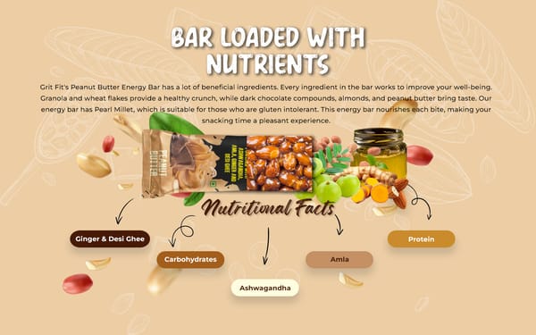 Introducing our Grit Fit Energy Bar in the delightful Peanut Butter flavor – a robust source of energy for your dynamic lifestyle. Crafted with a blend of nourishing ingredients, this energy bar is meticulously formulated to enhance your performance while delivering a gratifying taste experience with each mouthwatering bite. Ingredients include a mix of Granola (Jumbo Oats, Instant Oats, Oats Flour, Honey, Desi ghee), Wheat Flakes, Rice Crispies, Almonds, Dark Chocolate Compound, Pearl Millet, Date Paste, Soy Protein Isolate, Green Pumpkin Seeds, Liquid Glucose, Brown Rice Syrup, Vegetable Glycerine, Ashwagandha, Amla, Ginger, Soy Lecithin, and Rosemary for freshness. Elevate your vitality with the goodness of Grit Fit Energy Bar.